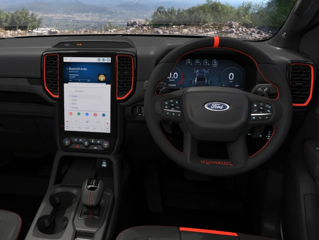 Bold ‘F-O-R-D’ letters on the grille signals nothing about Raptor is low-key. Matrix LED headlamps, a chassis mounted bumper and a 2.3mm-thick high-strength steel bash plate out front, ready to lead the way.
